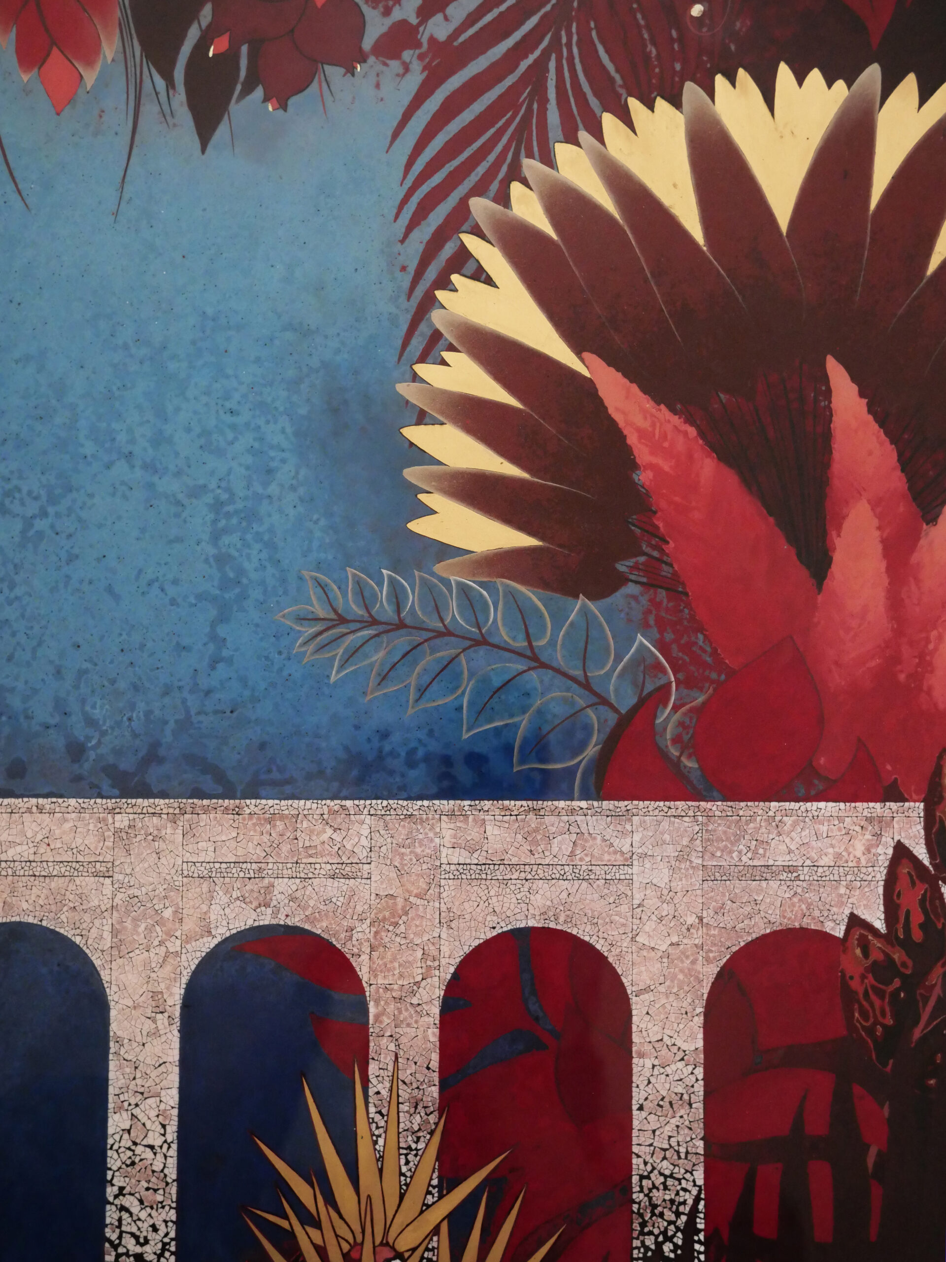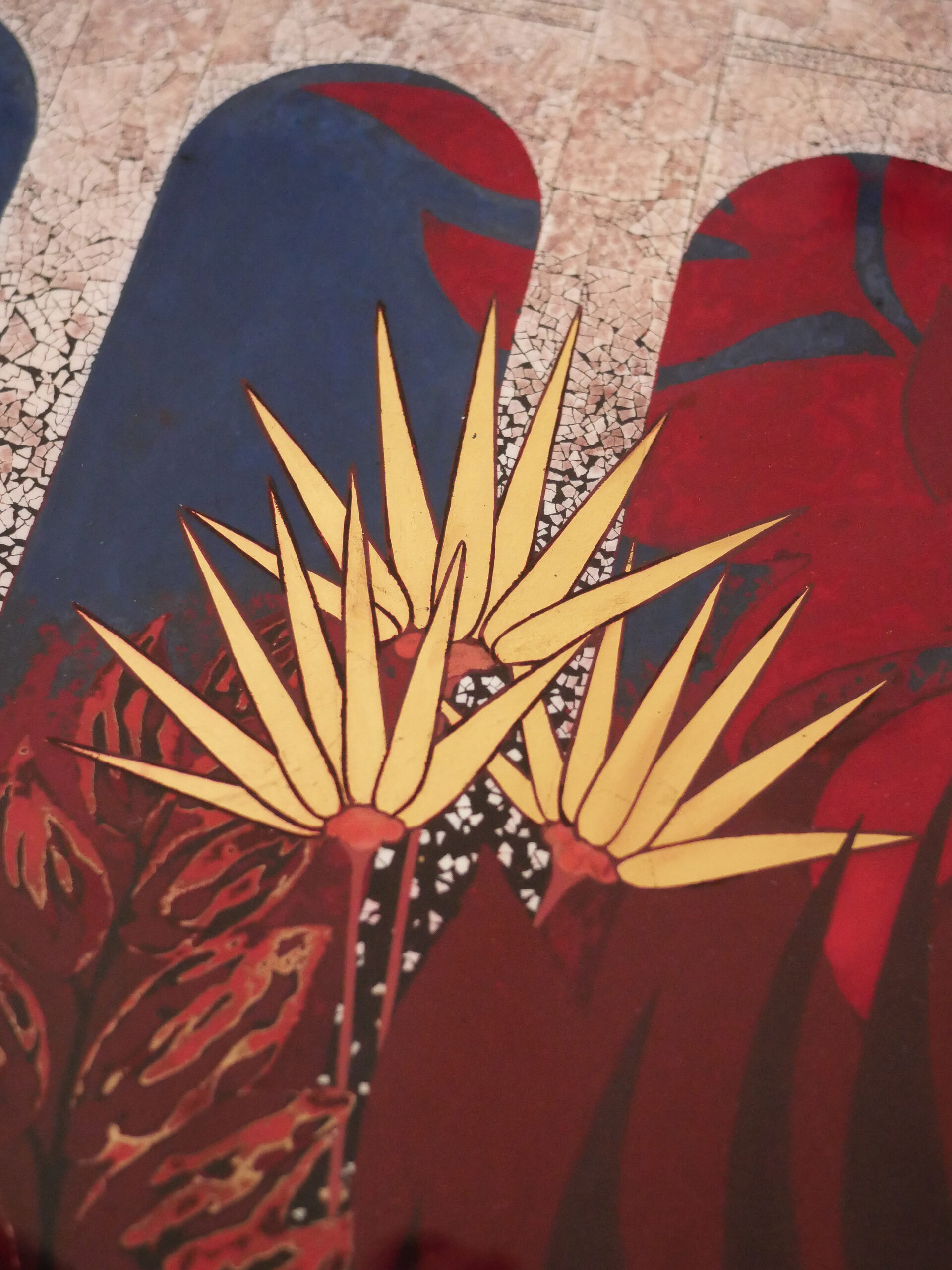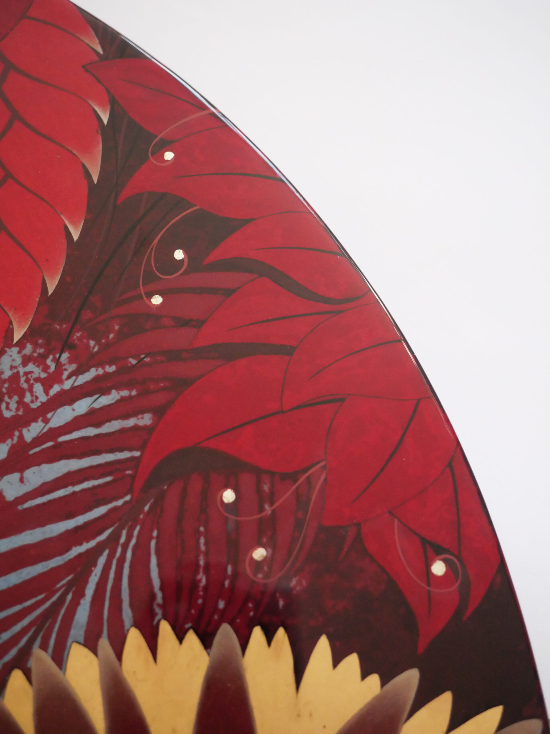 Laque européenne et hydrosoluble sur bois, incrustation de coquilles d’oeuf, de feuilles d’or, d’argent et de palladium