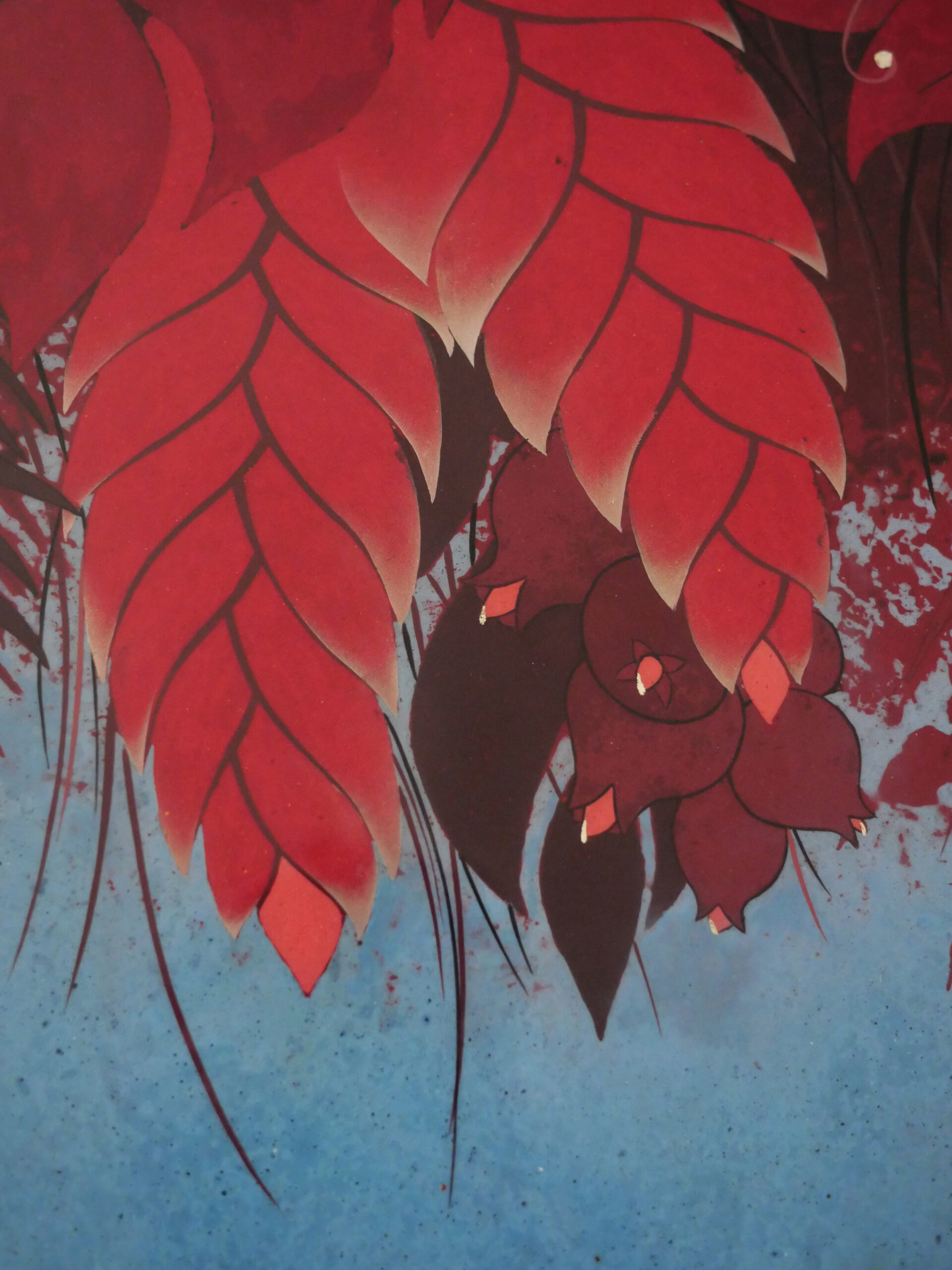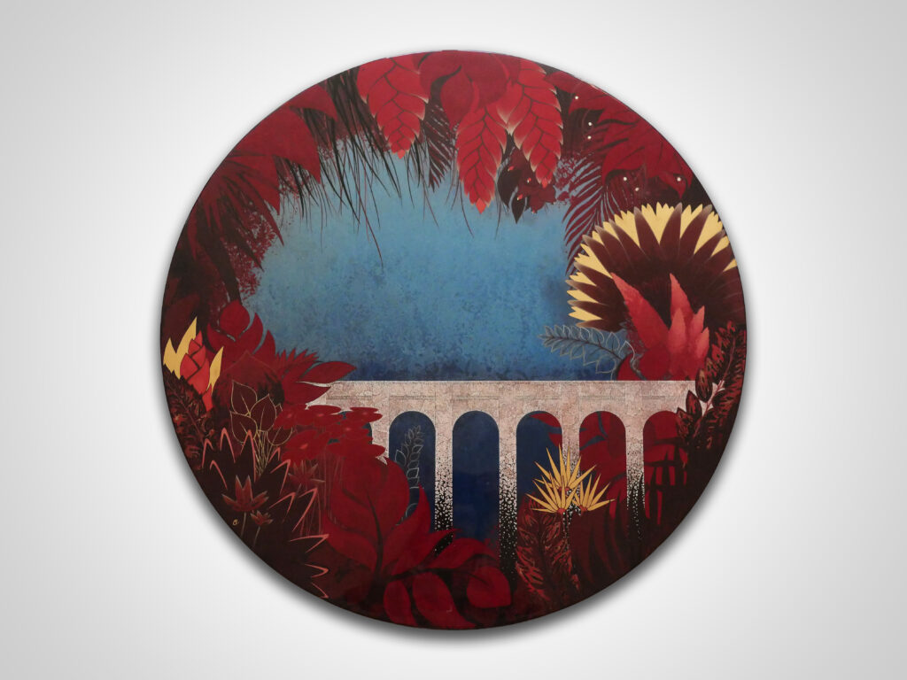 Laque hydrosoluble et polyuréthane sur bois, incrustation de feuilles d’aluminium et d’argent oxydé.